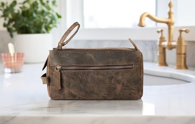 This 23.6 x 12.7 x 10.9 cm Dopp kit, crafted from full-grain buffalo leather, screams old-school cool with a distressed finish. Its roomy main compartment swallows full-sized shampoos, razors, and brushes, while a water-resistant lining and YKK metal zippers keep spills locked down. An external zipper pocket stashes small gear, and the sturdy, non-rigid leather ensures it holds up on the road. It’s handmade for timeless durability, perfect for the stylish dad vibe.